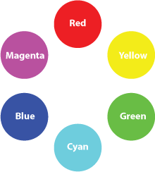By combining the colors red, green, and blue you can get just about any other color your human eyeball can see, such as these six, basic colors shown in this simple color wheel: