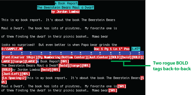 See the redundant bold codes in there? They bold nothing, and they could potentially cause a problem in the text. Yet by using Reveal Codes, you can discover where such problems are and easily fix them. After all, trying to delete invisible codes is a toughie — even for a nerd.