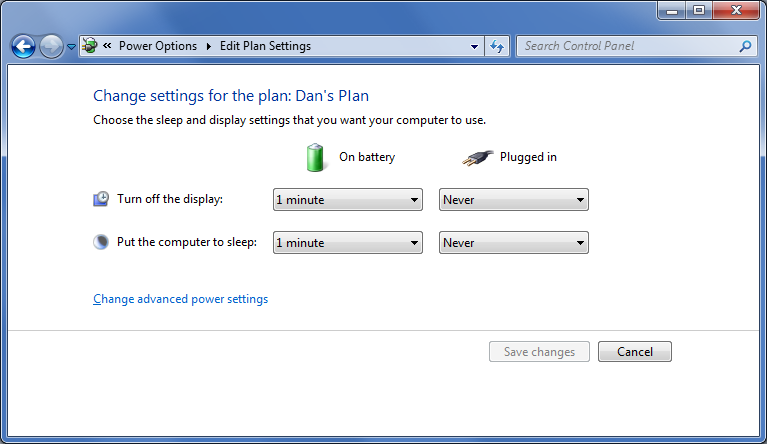 Figure 1. Settings for my PC’s power plan. When the system runs from battery power, it shuts itself off after one minute.