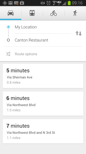 Choose a transportation method, then touch a card to select a route. The next screen shows a map with directions highlighted in blue. Touch the Start button at that point to use Navigation and be directed to the destination.