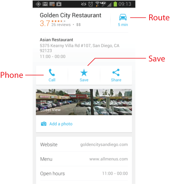 On a tablet, you won’t see the Phone (Call) button, shown in Figure 2. Instead the Route or Distance button (found in the upper right corner of the screen in Figure 2) appears in that location.