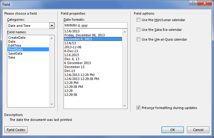 - Choose the PrintDate field from the list of Field Names. You can pare down the Field Names by first choosing a category from the Categories menu. In this case, the Date and Time category works.