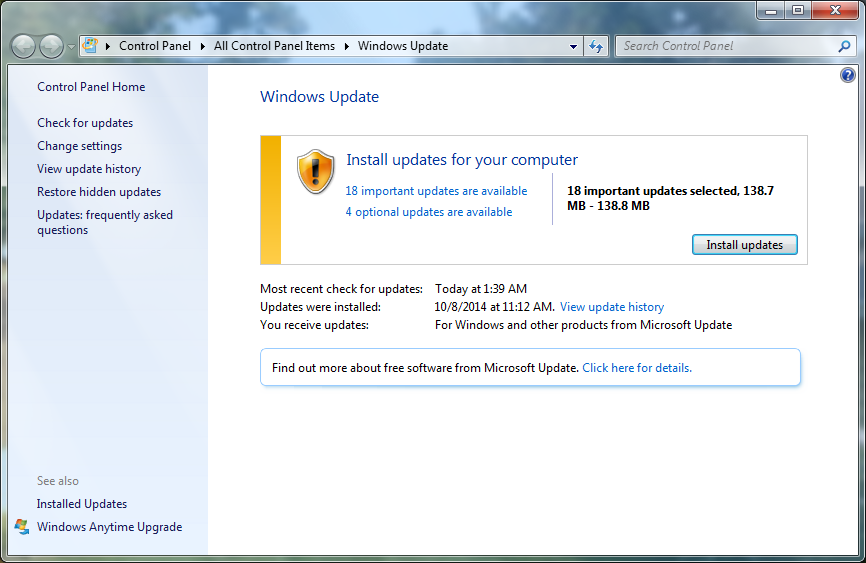 To try to avoid the shutdown or restart, check the Windows Update window, which is really part of the Control Panel. Even so, you can open the Start button menu, choose All Programs, then Windows Update. The Windows Update window is shown in Figure 3.