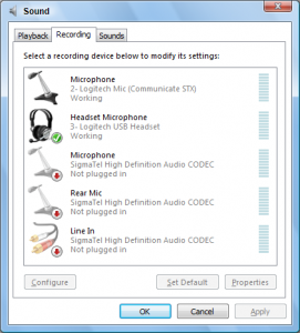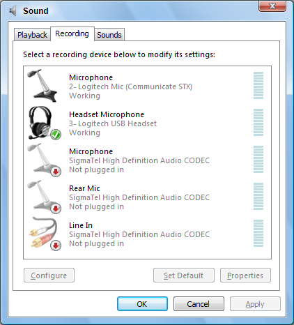 If your PC is like mine (above), you’ll see several actual and potential recording devices, some of which may not be available. You need to find the one that’s producing the noise. How can you tell? Make noise! You’ll see the volume indicator bump a bit.
